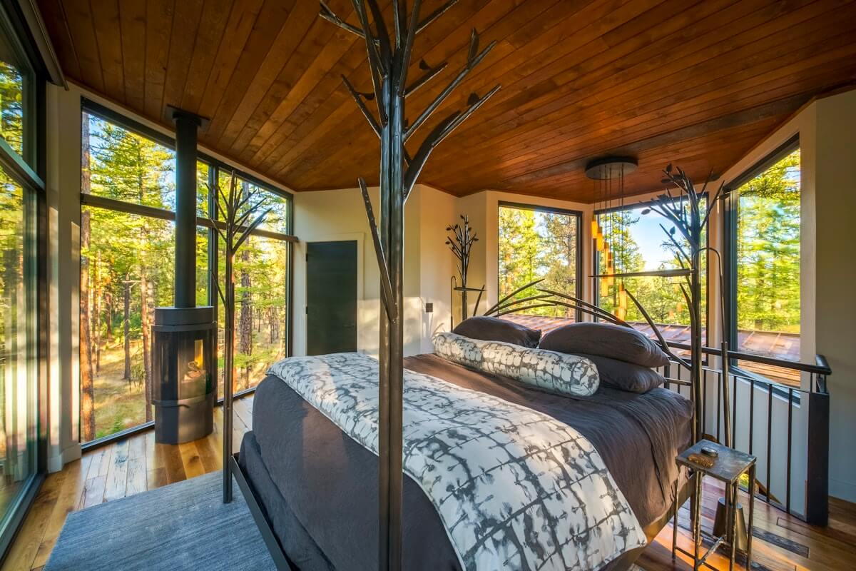 Outside, The Green O Tree Haus reads like modernist Tetris: clean volumes, sharp lines, a cylindrical spiral staircase at the core. Inside, it loosens—floor-to-ceiling windows, leather and wrought-iron accents, a fireplace that turns winter blue into a mood. There’s more than 1,000 square feet of living space to spread out, plus two terraces that make the forest feel like your living room; down at ground level, a private hot tub waits under the stars. (Yes, you’ll linger too long. Worth it.)